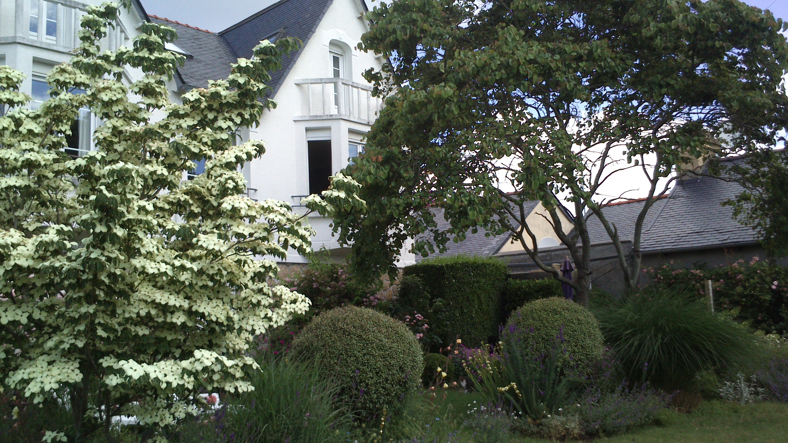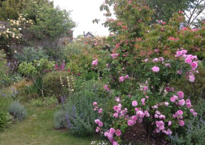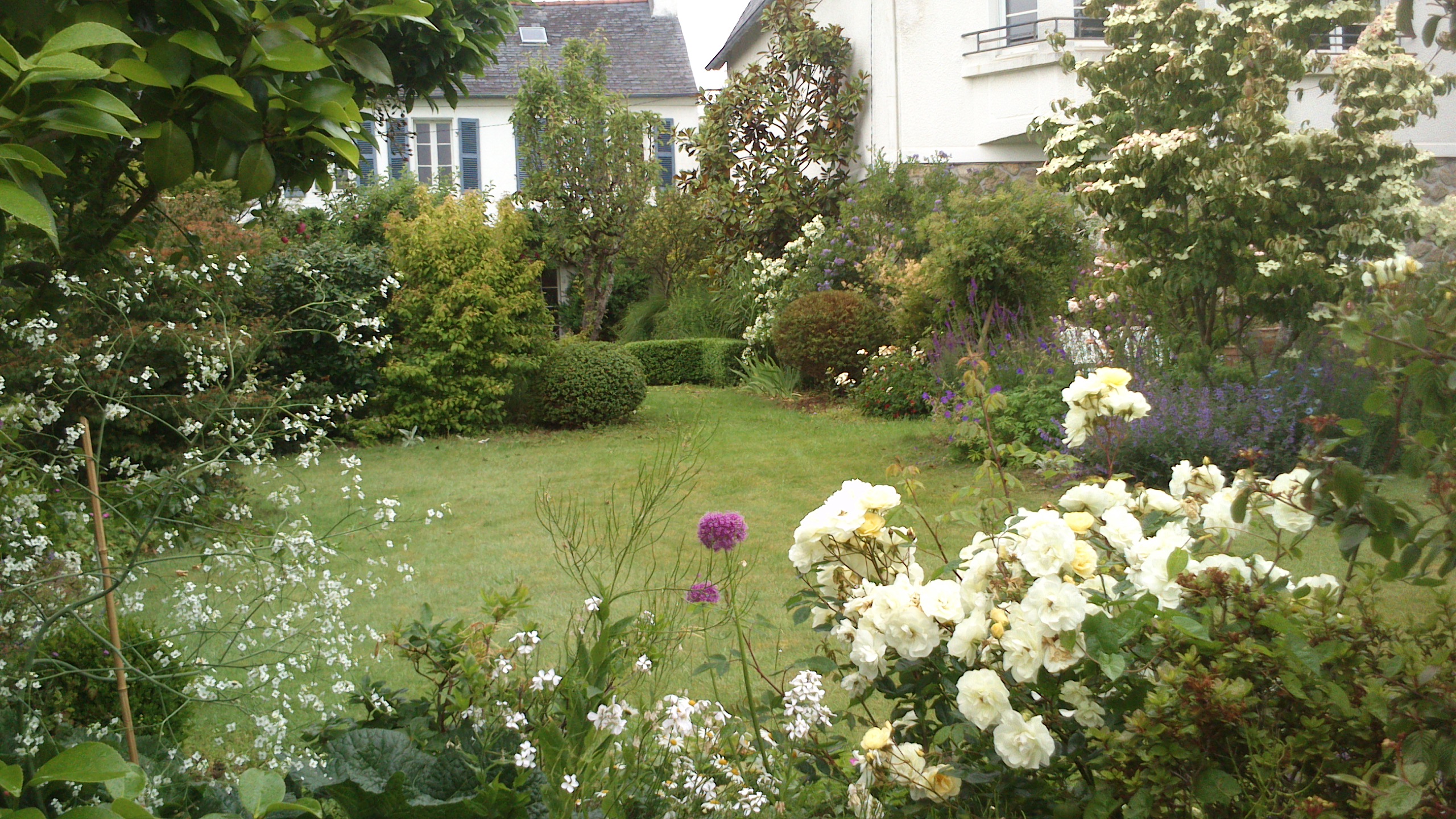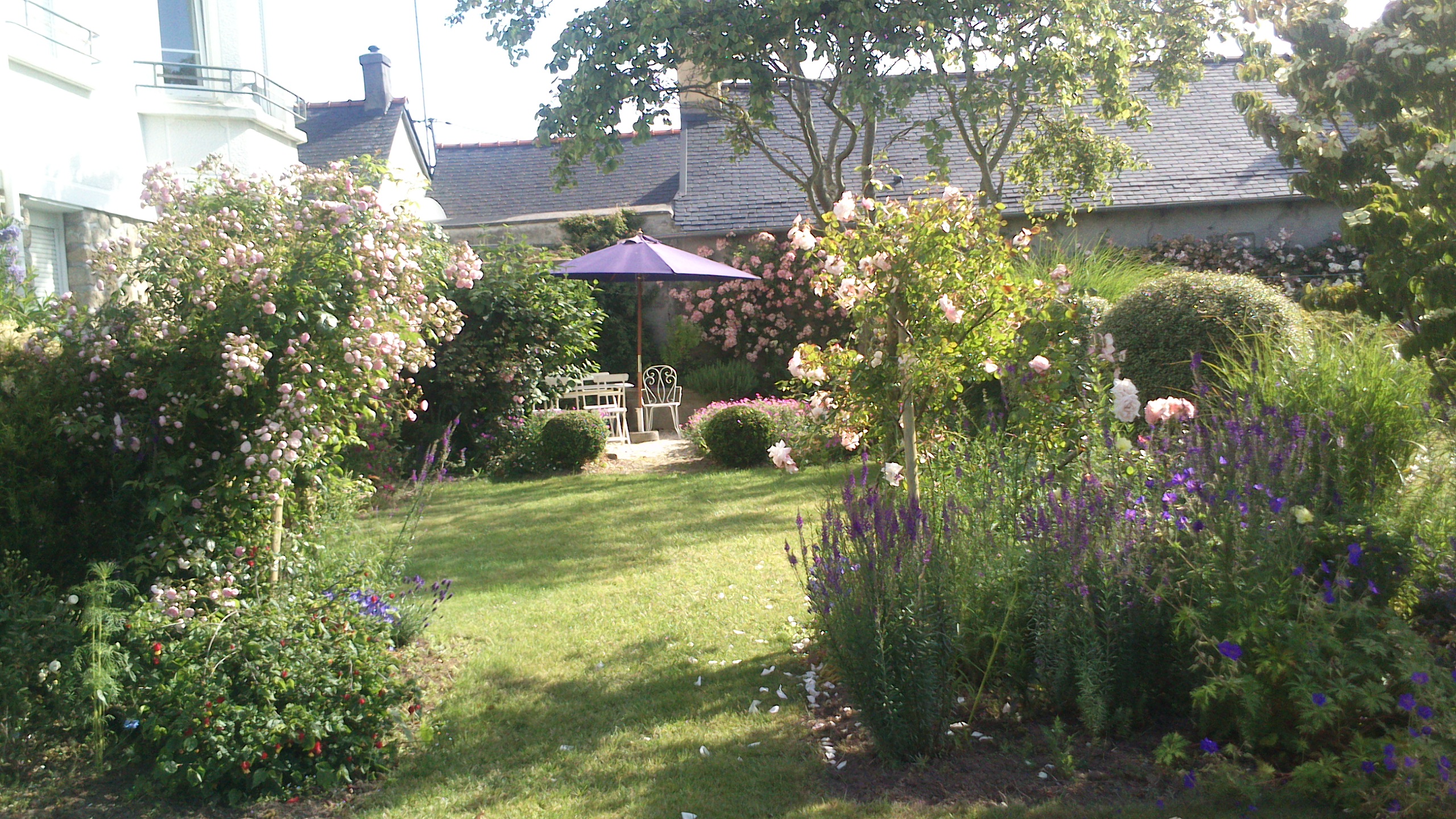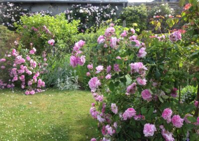 Juste à côté de l’habitation, on trouve une belle pelouse carrée, structurée et ombragée par un majestueux arbre de Judée. Elle est délicatement bordée de rosiers et de vivaces, créant un premier tableau floral élégant et coloré, idéal pour profiter des beaux jours au calme.