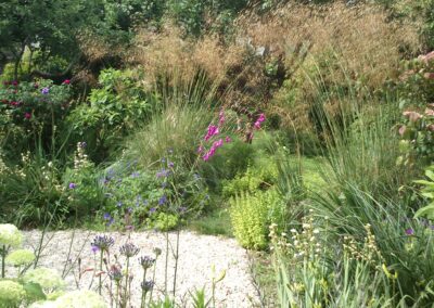 Plus loin, un charmant jardin aux allées gravillonnées s’offre au visiteur. Entouré de plantes à floraison estivale, cet espace évoque la douceur des après-midis ensoleillés, avec ses parfums et couleurs vibrantes.
