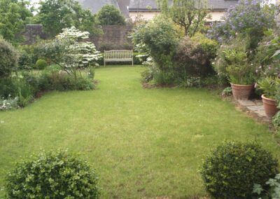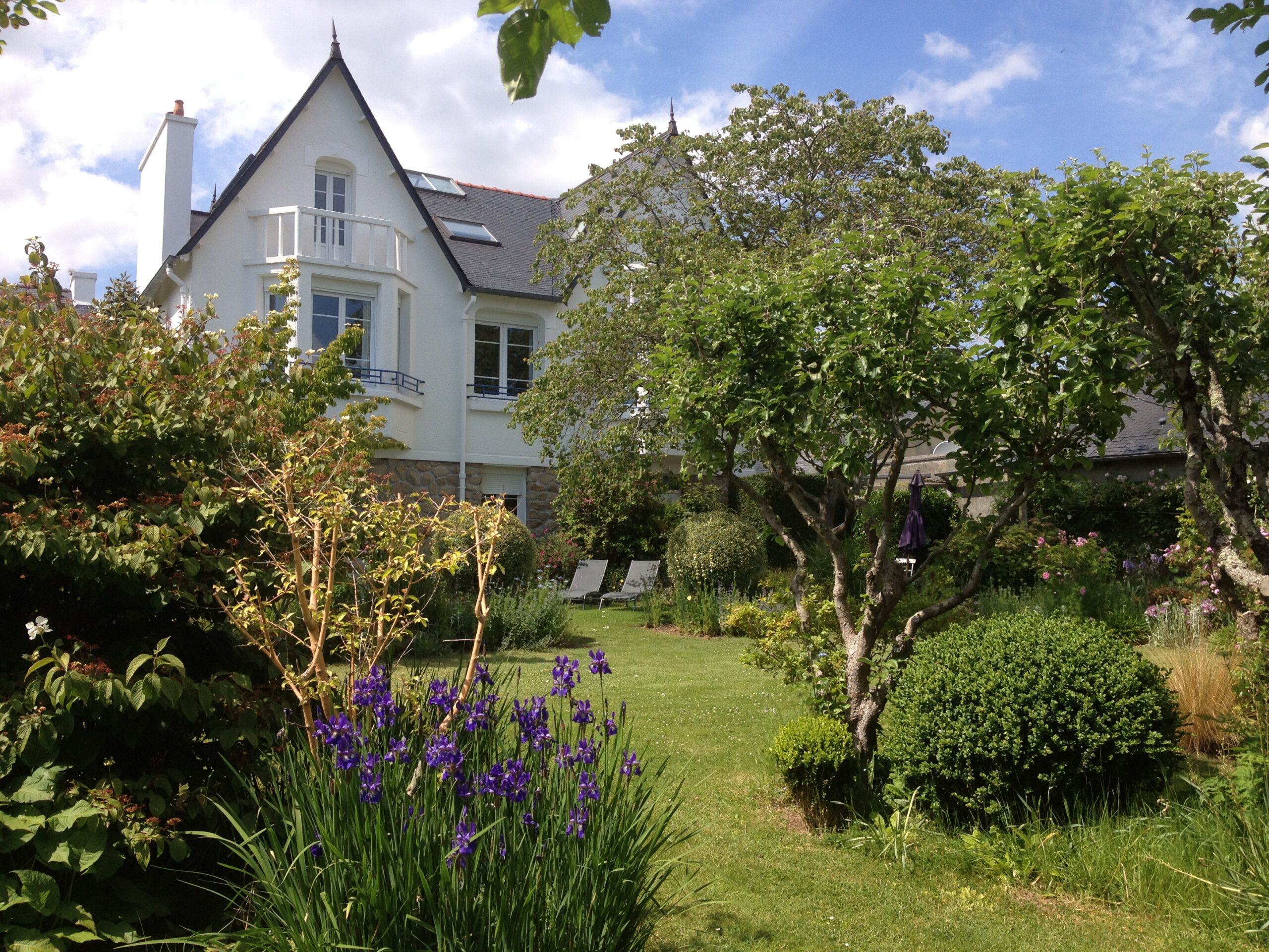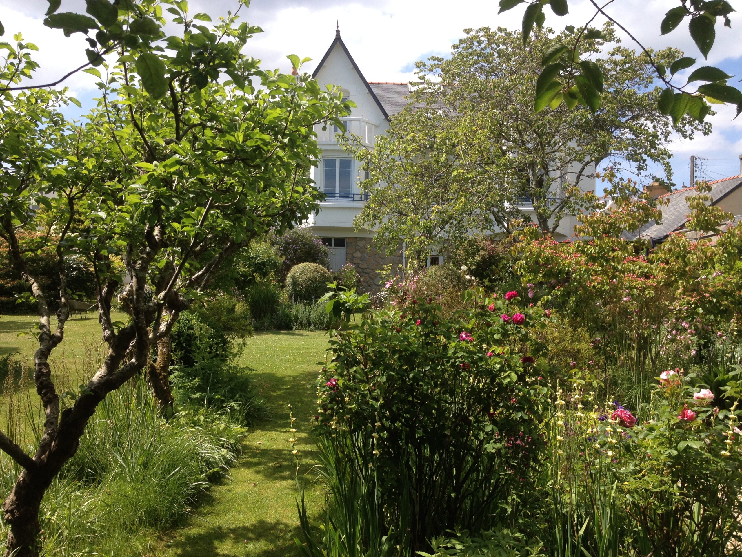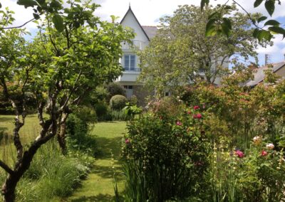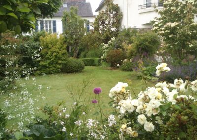 Un écrin de nature au cœur de la ville. Le jardin s’articule en scènes harmonieuses : un carré de gazon sous l’arbre de Judée, bordé de rosiers et de vivaces ; un jardin de graviers aux floraisons estivales ; une allée d’iris et de rosiers grimpants ; un verger libre où fleurit le gazon.