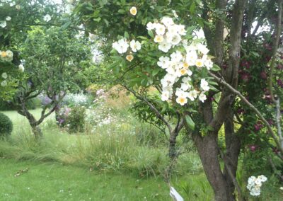En remontant vers le fond du jardin, le verger s’installe en douceur, avec ses arbres fruitiers bien espacés, entourés d’un gazon fleuri qui favorise la biodiversité et les insectes pollinisateurs. Cet espace plus sauvage contraste joliment avec les zones plus ornementales, et invite à la contemplation ou à la cueillette.