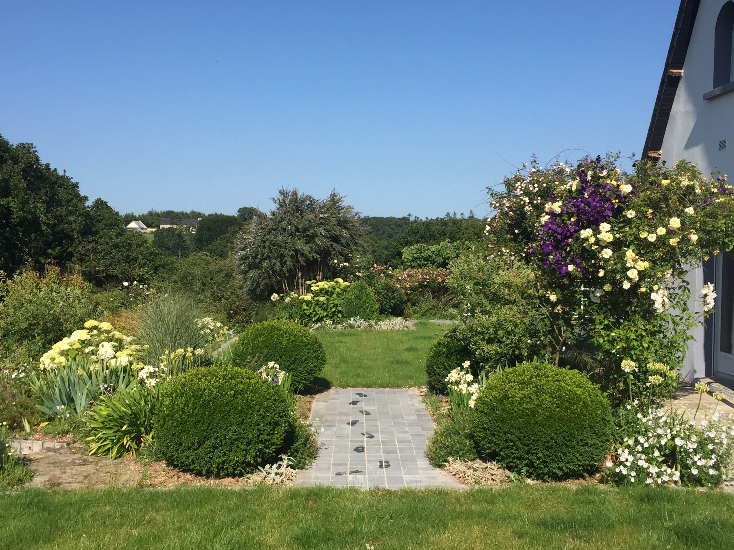 Des buis ouvrent le chemin. Le kiosque fleurit parmi iris et rosiers. Le parc s’étend sous les vieux chênes, le printemps éclot en azalées, l’été brille en terrasses. Près de la maison, le jardin blanc apaise, et le potager médiéval veille autour de sa fontaine.