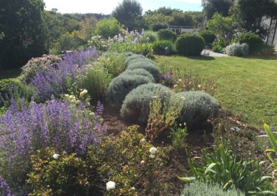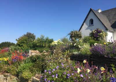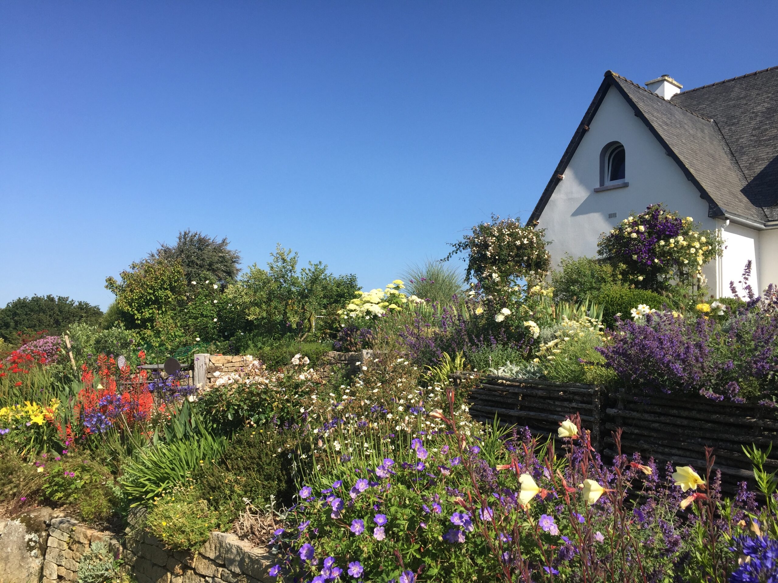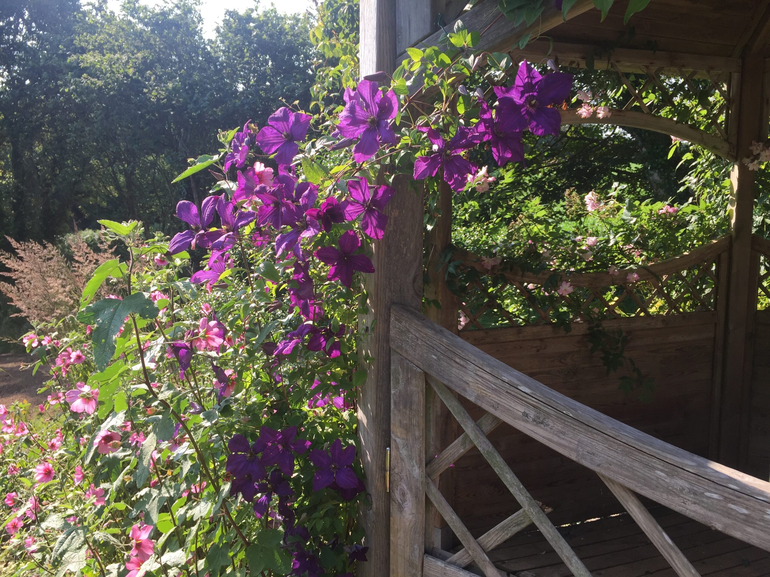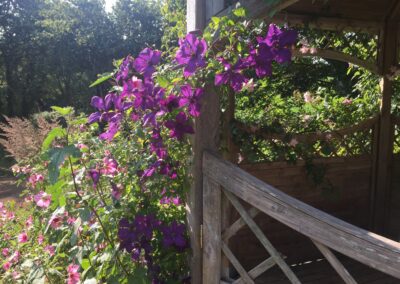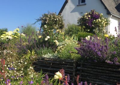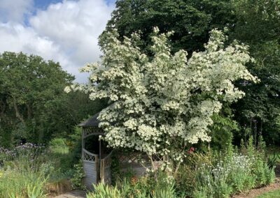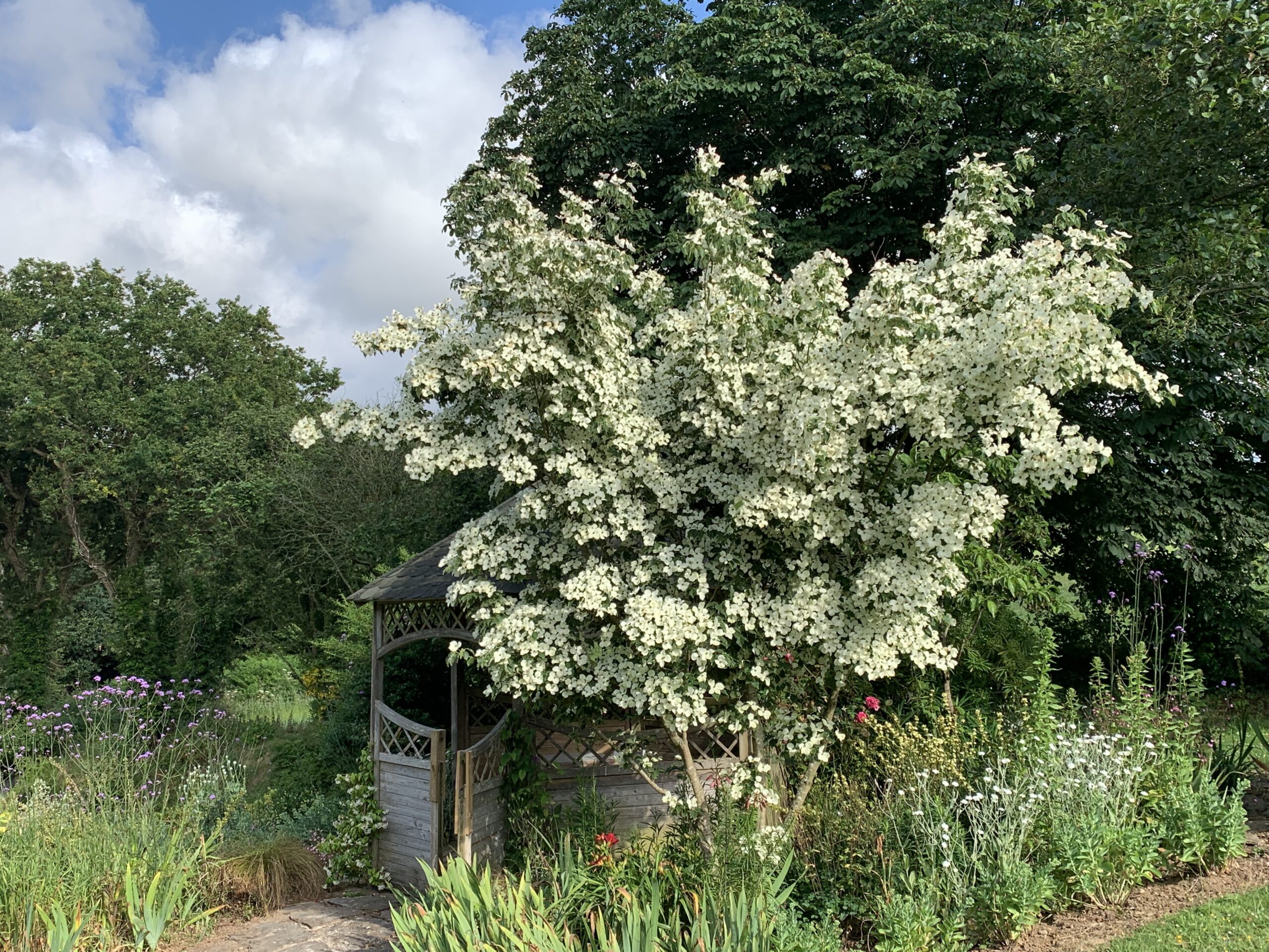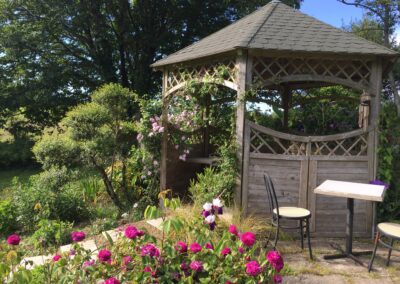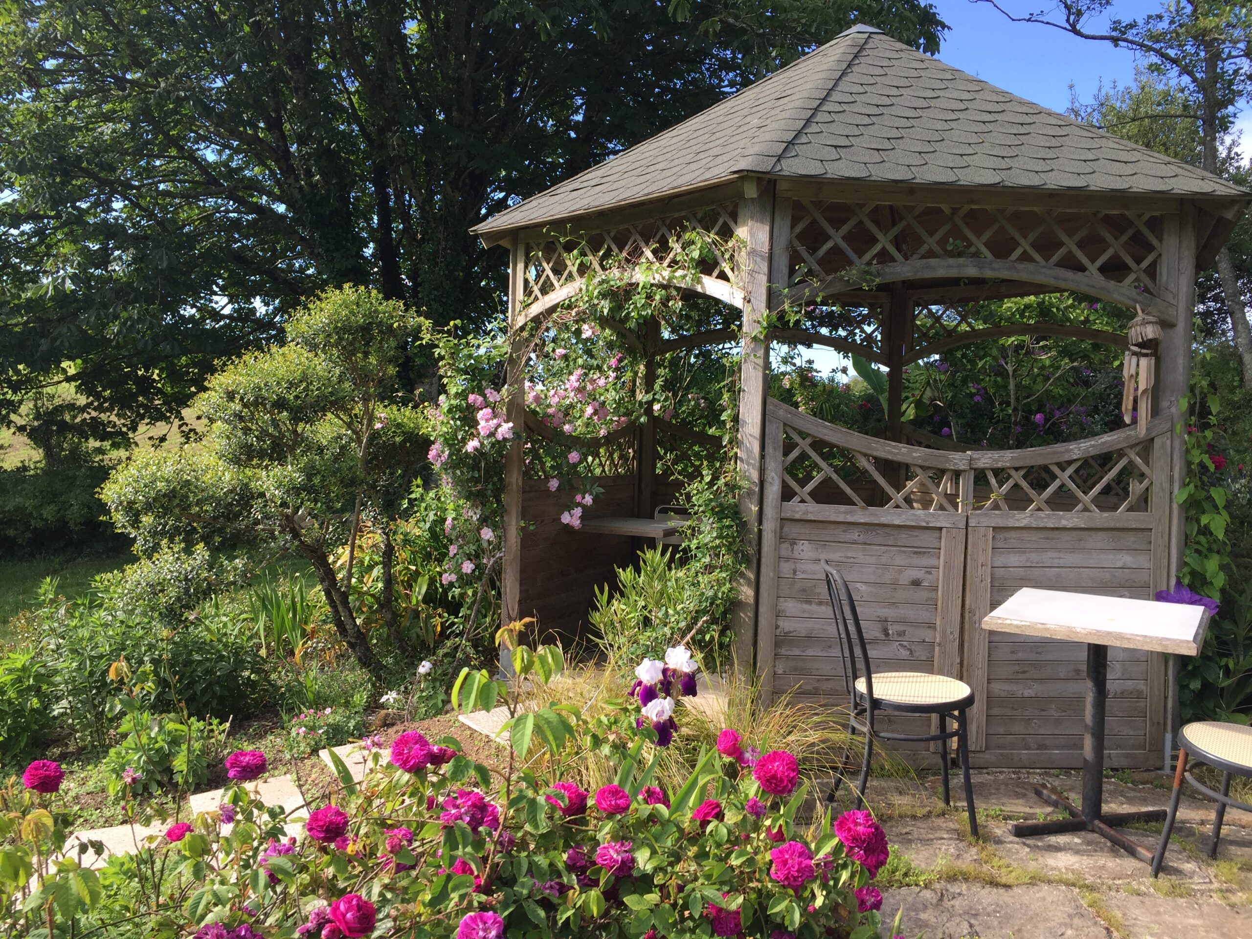 Un peu plus loin, un kiosque romantique se dévoile, entouré d’iris, de clématites et de rosiers. À ses pieds, de grandes vivaces annoncent les couleurs chaudes de l’automne.
