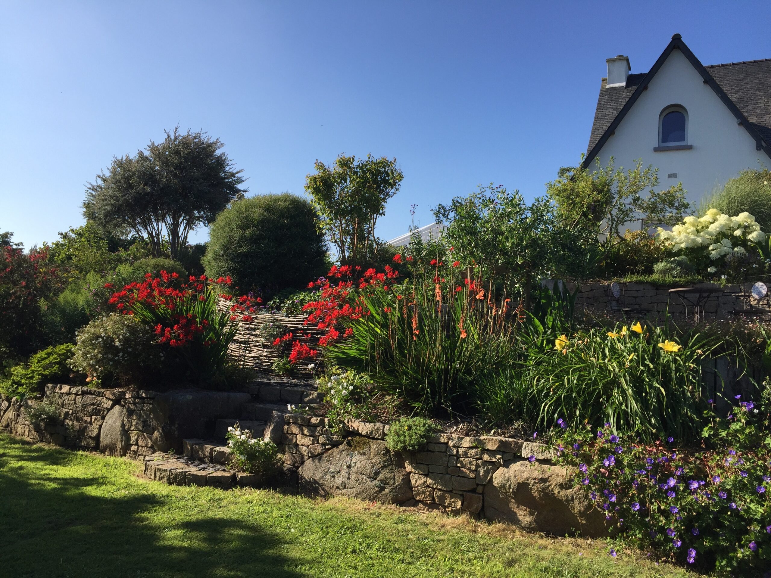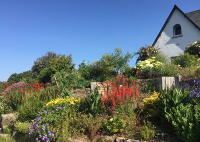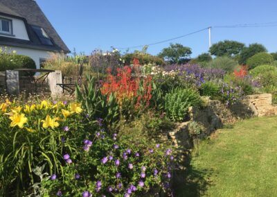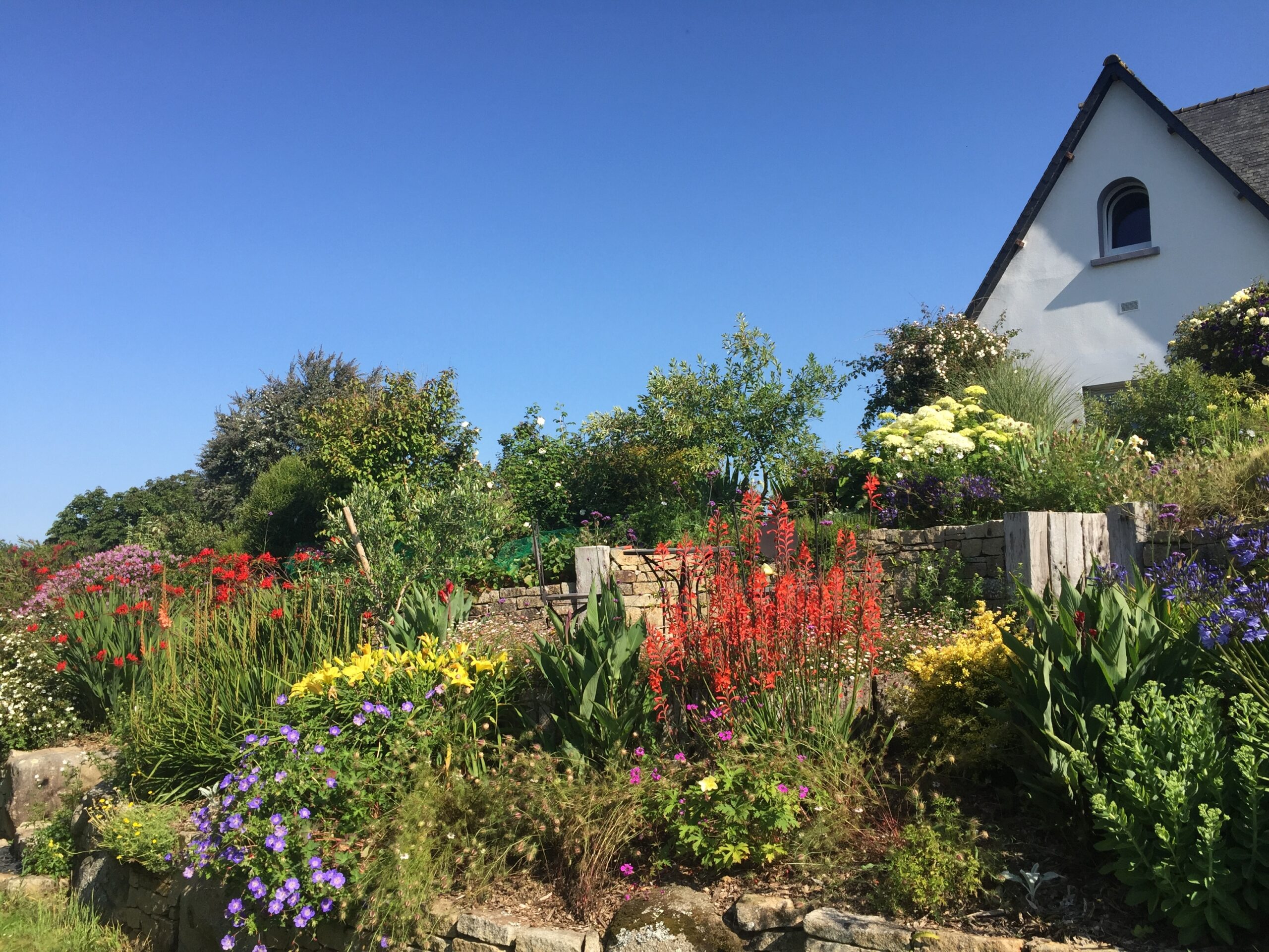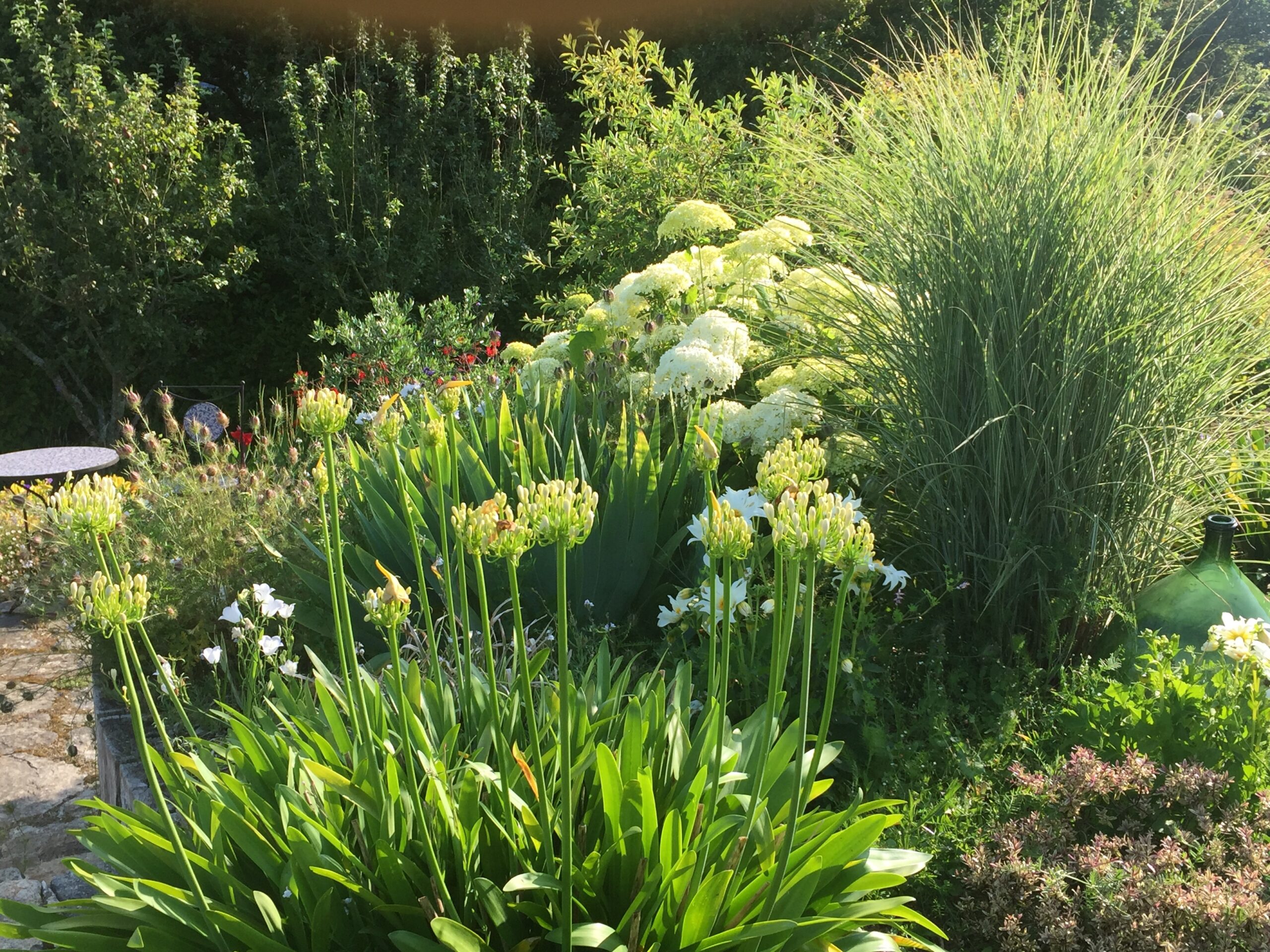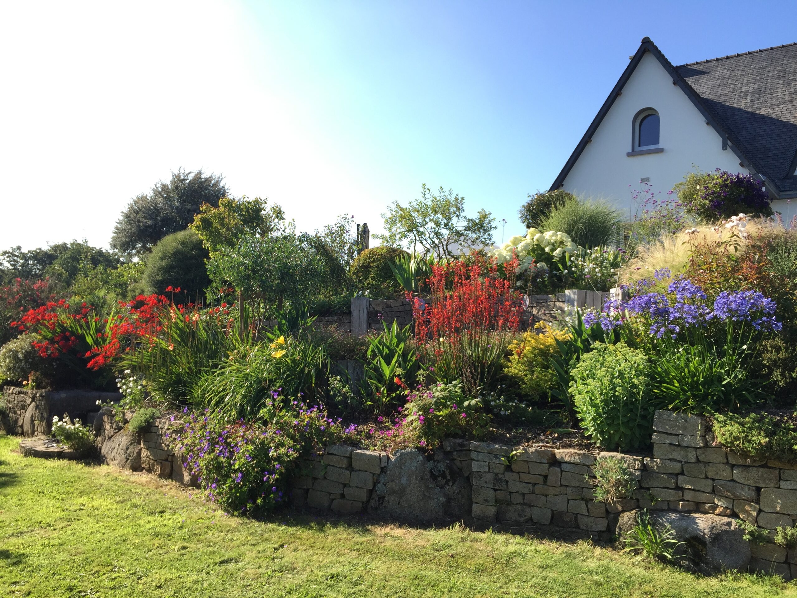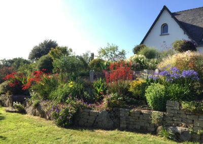 En surplomb, ce jardin ensoleillé accueille watsonias, agapanthes, solidagos et autres vivaces éclatantes dans une explosion estivale de couleurs.