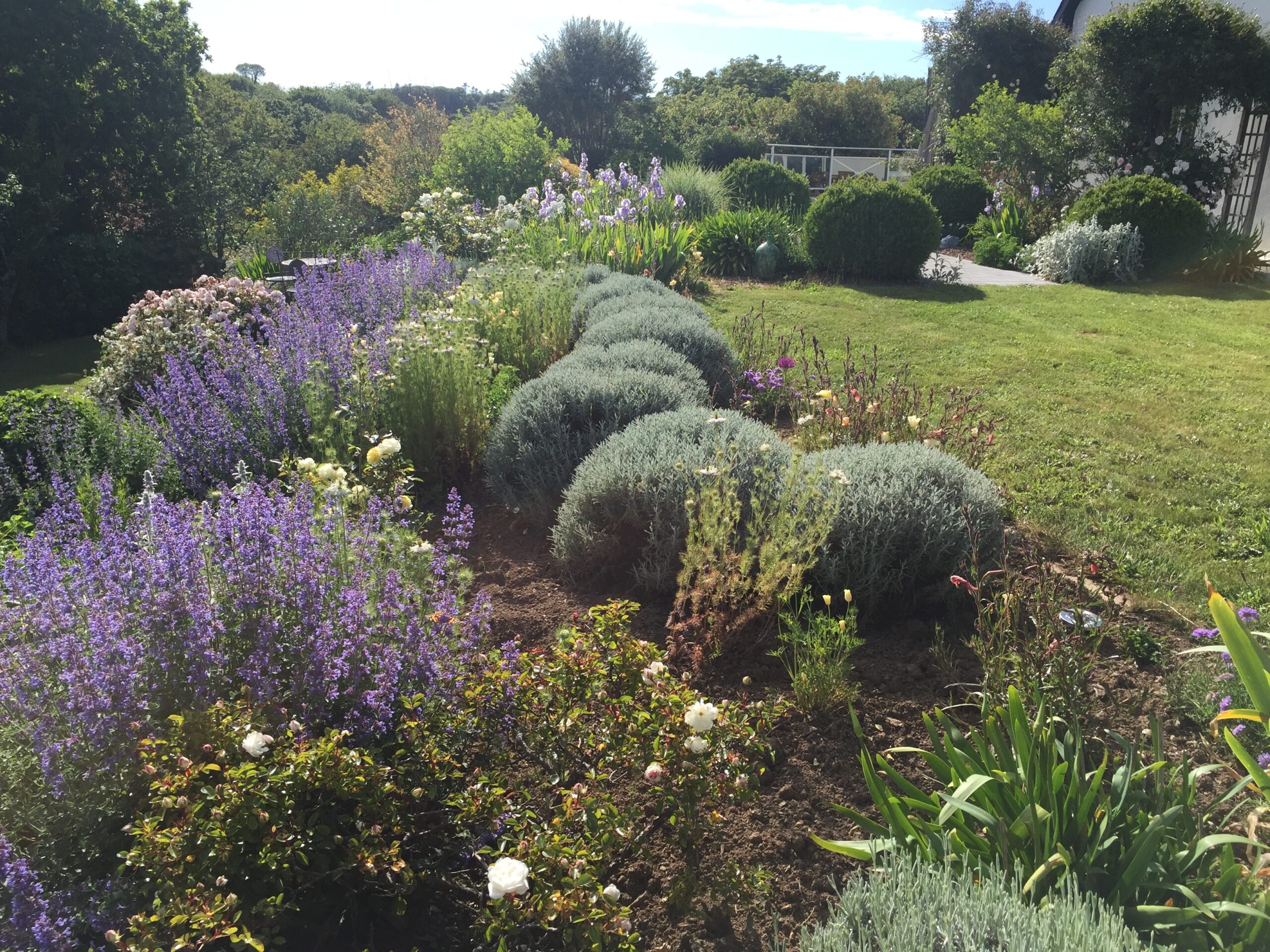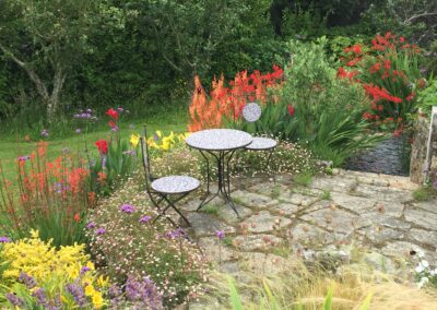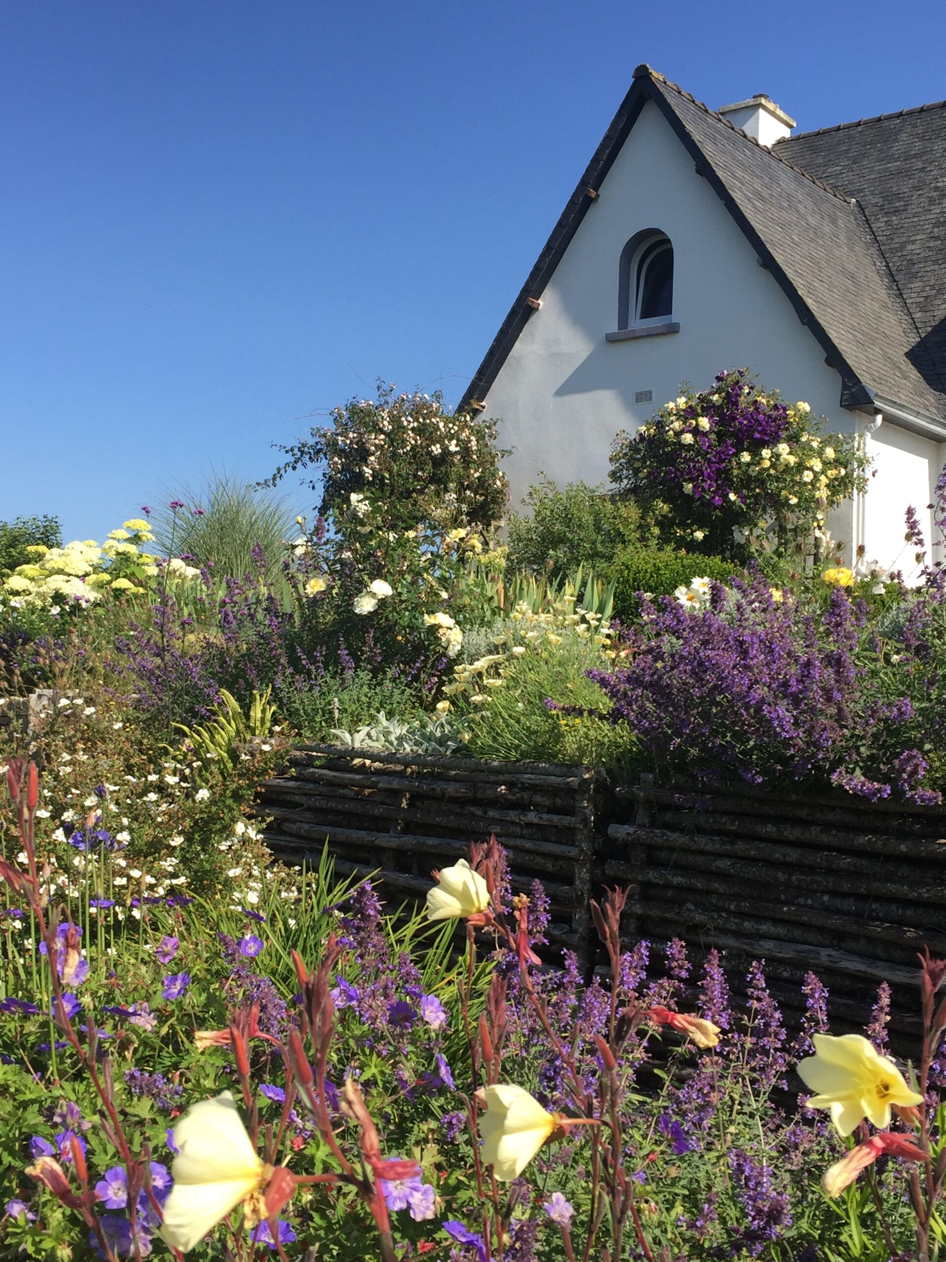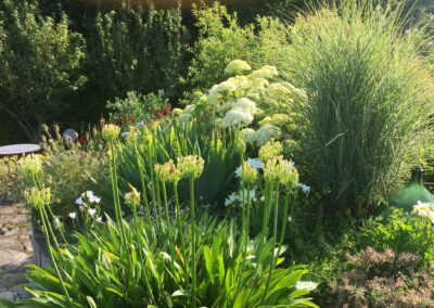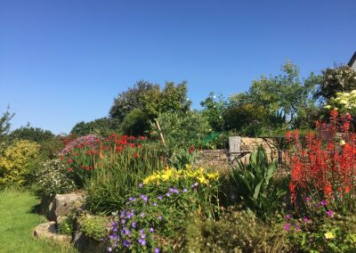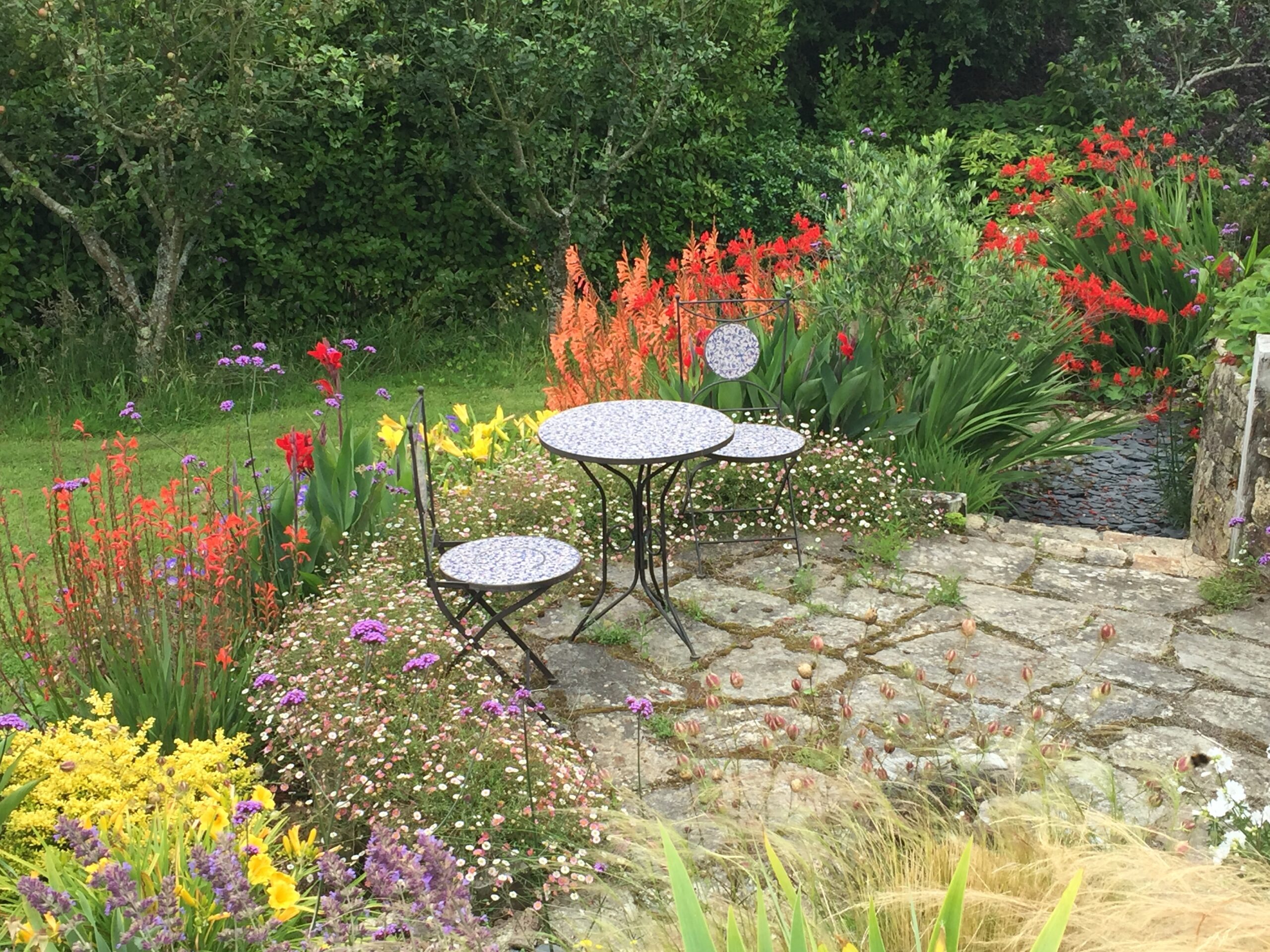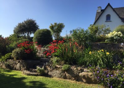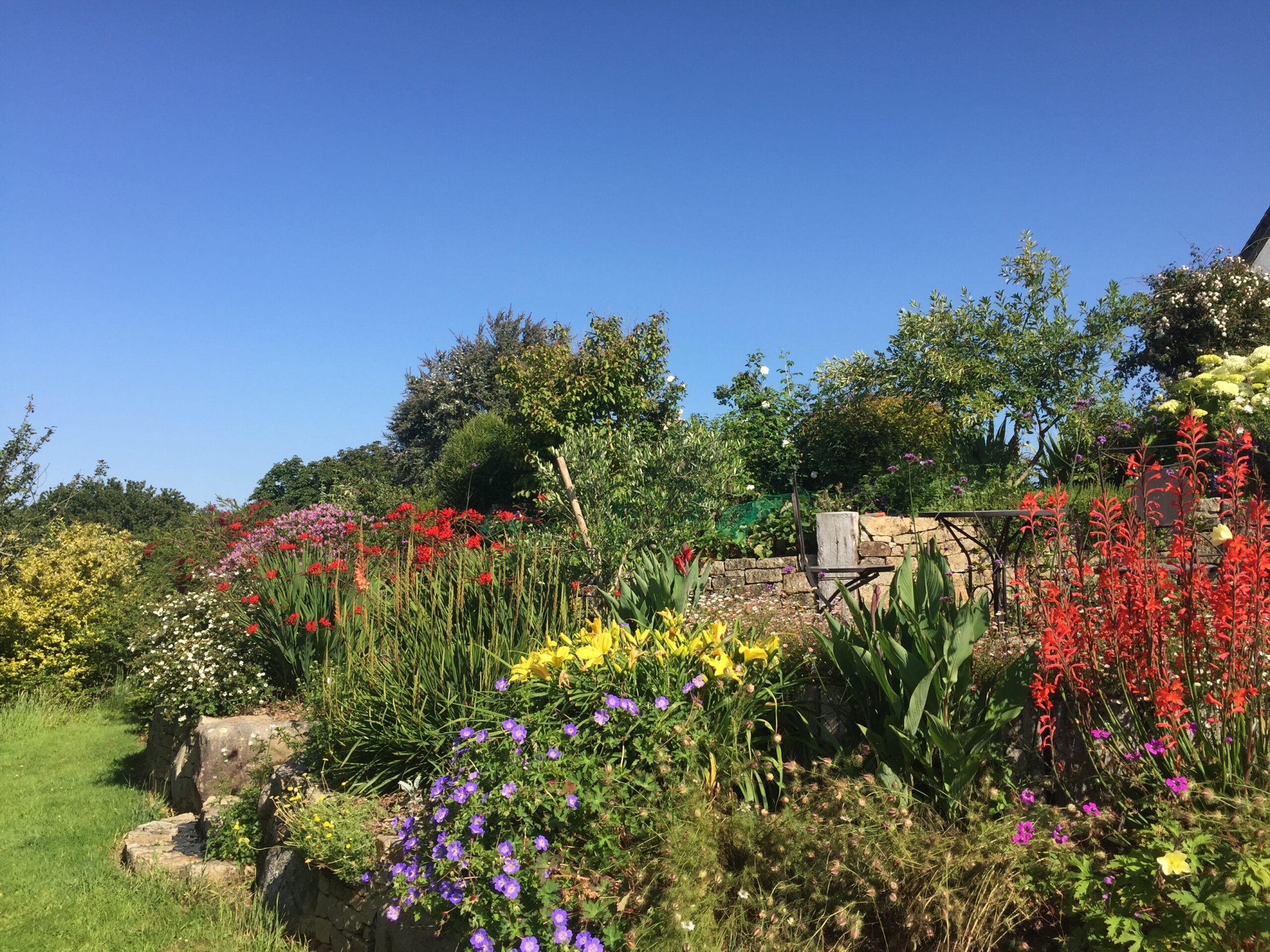 En surplomb, ce jardin ensoleillé accueille watsonias, agapanthes, solidagos et autres vivaces éclatantes dans une explosion estivale de couleurs.