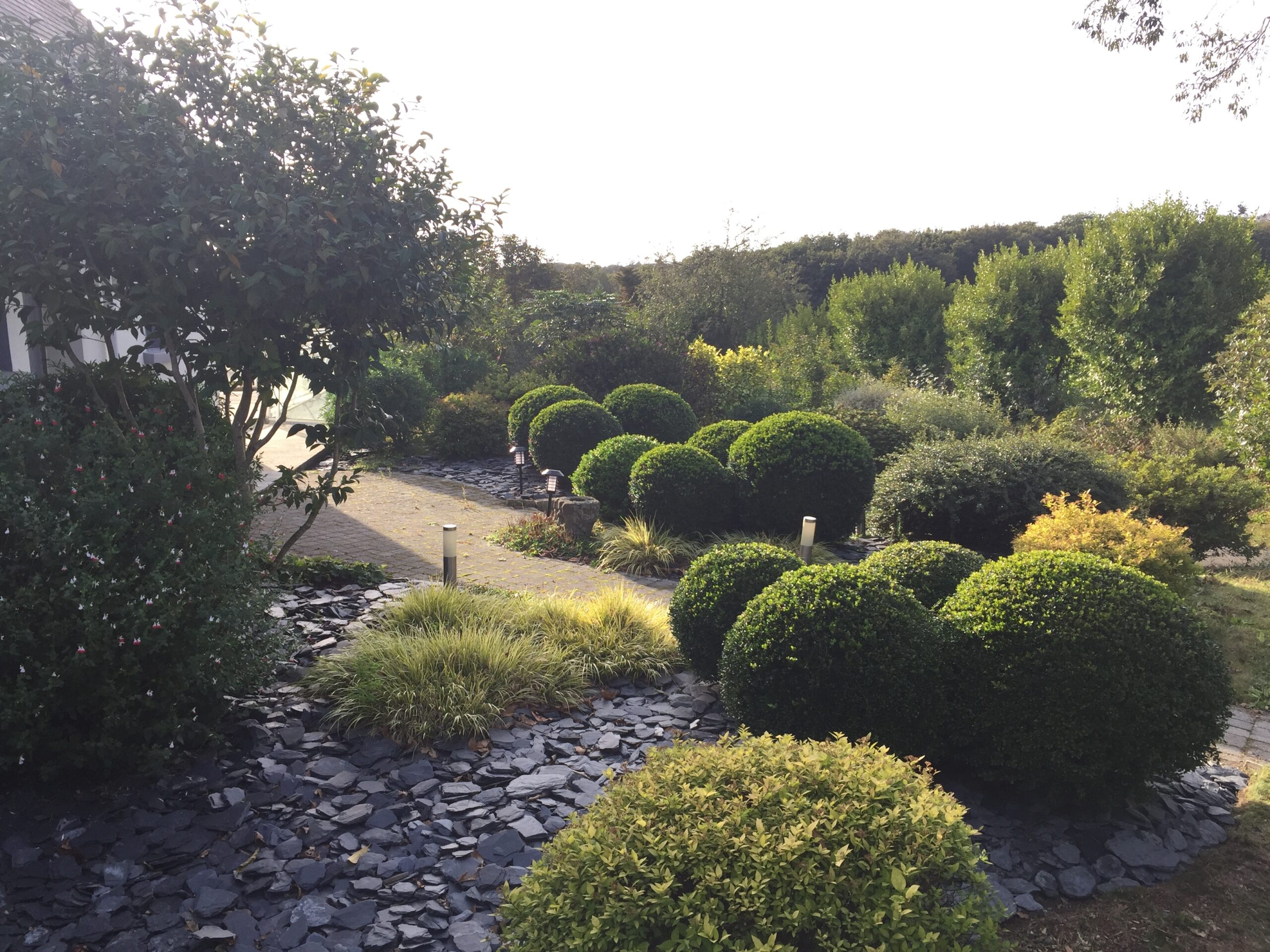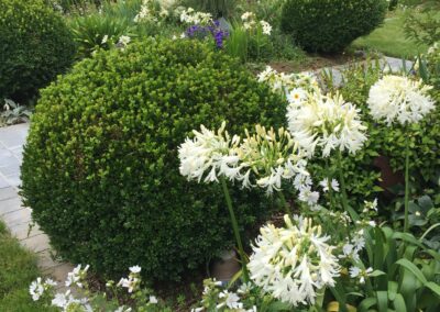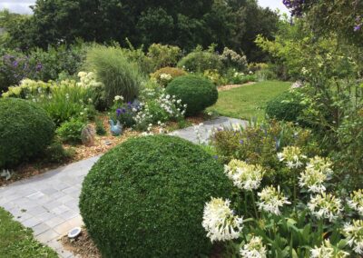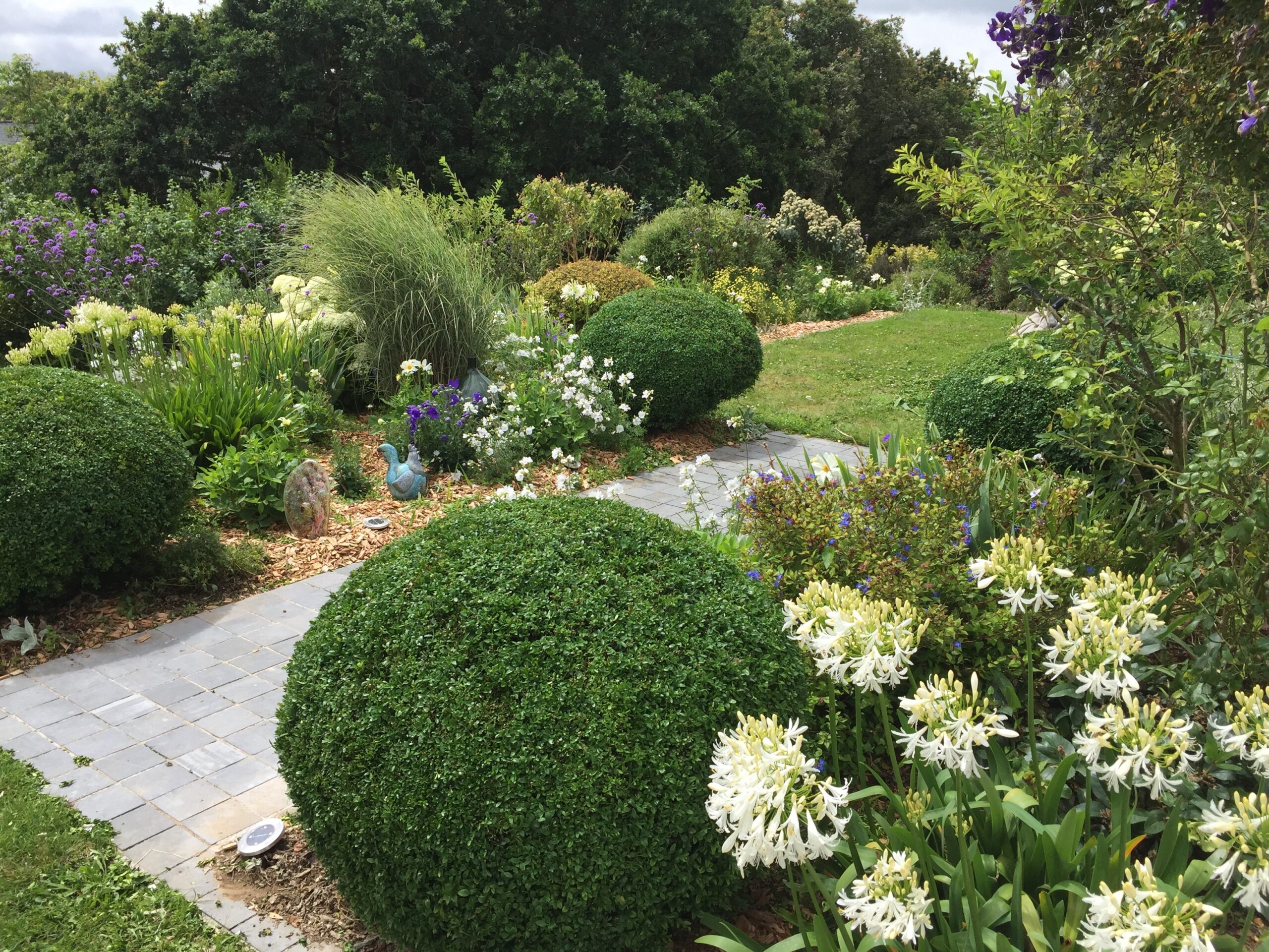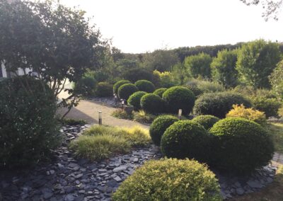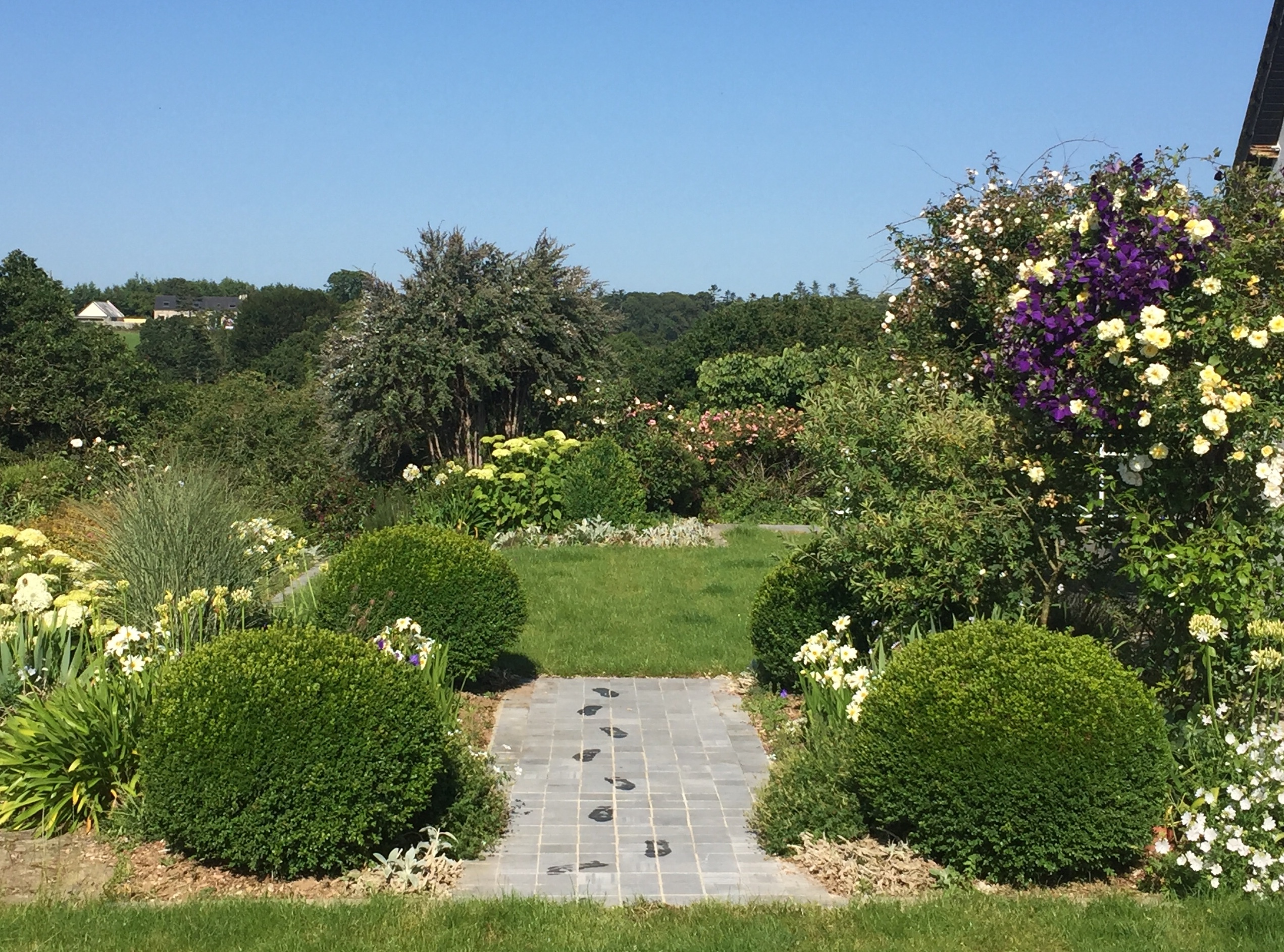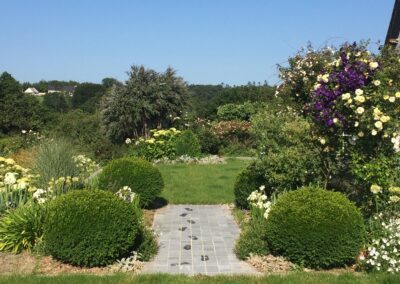 Dès l’arrivée, une allée bordée de topiaires de buis taillés en boule donne le ton : équilibre, ordre et beauté.