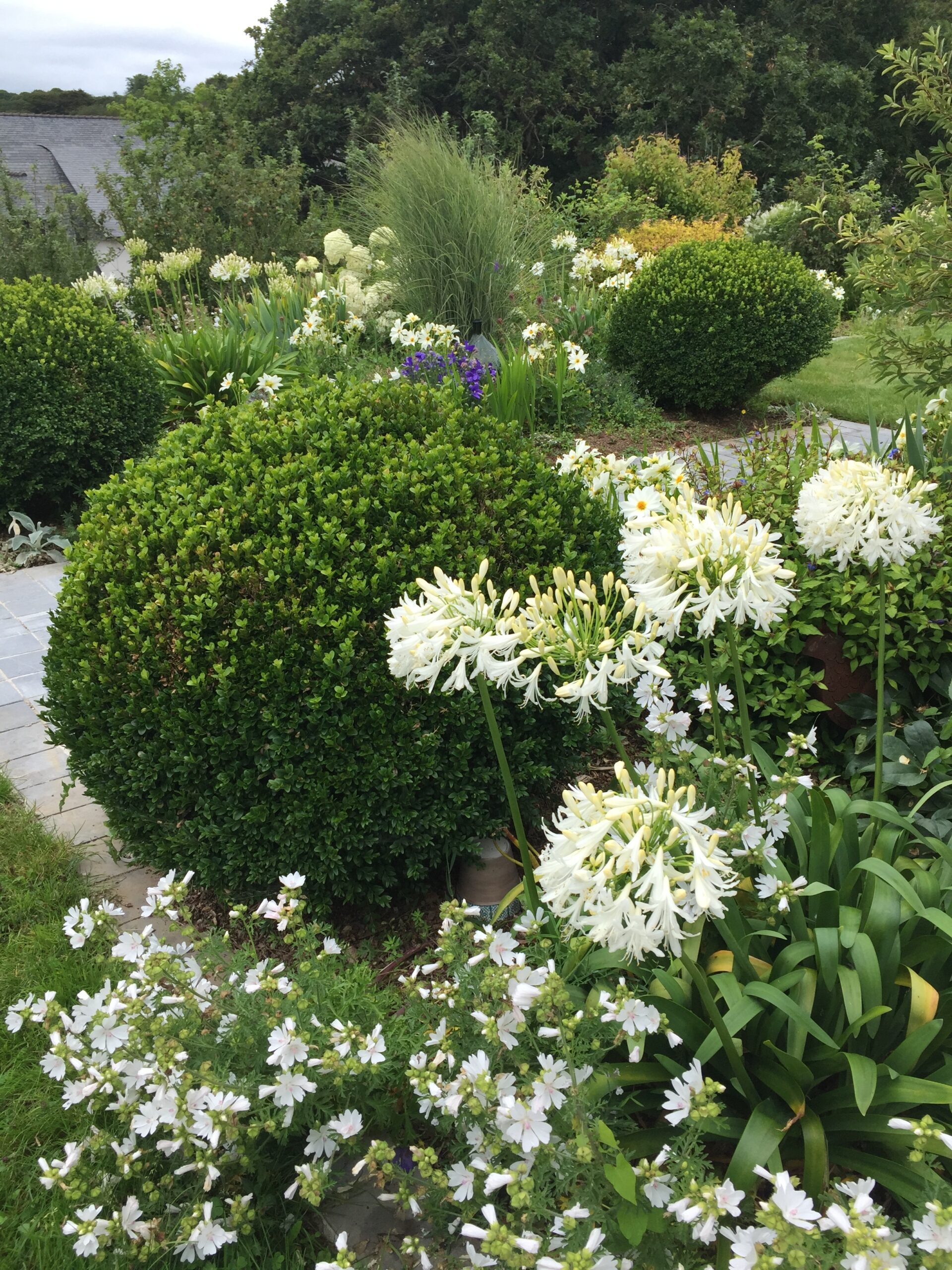 Près de la maison, deux grands carrés de pelouse structurent un jardin monochrome, dédié aux floraisons blanches et feuillages argentés.