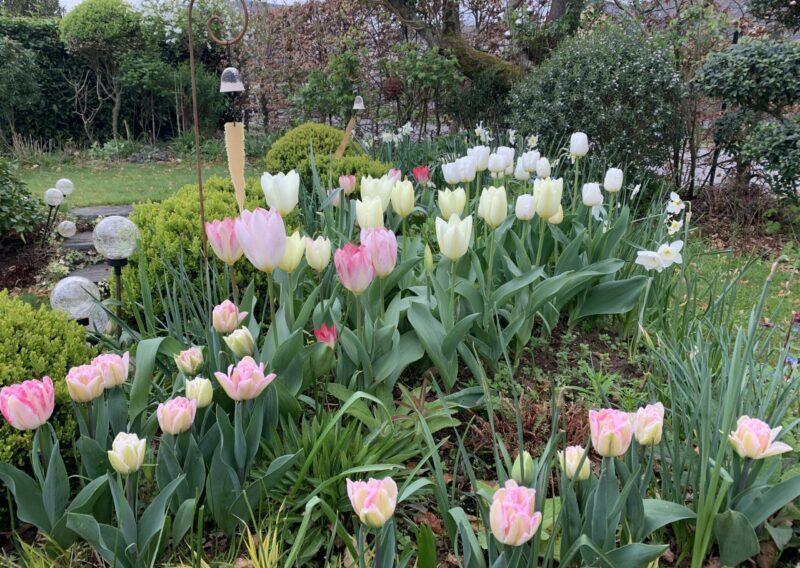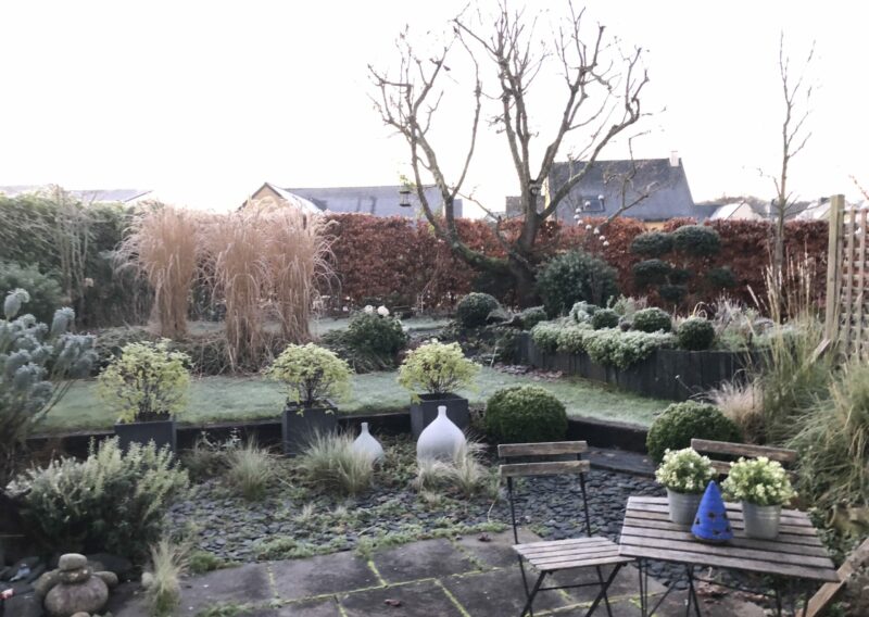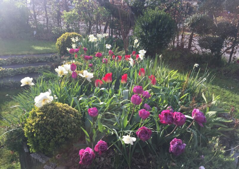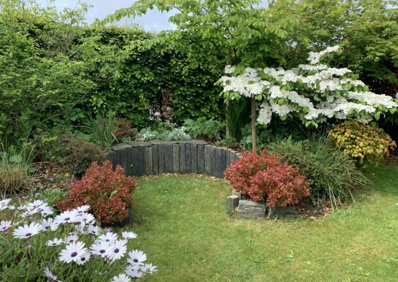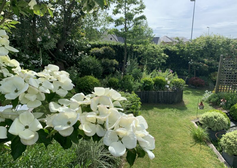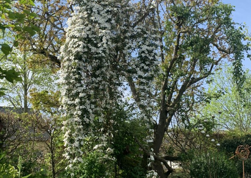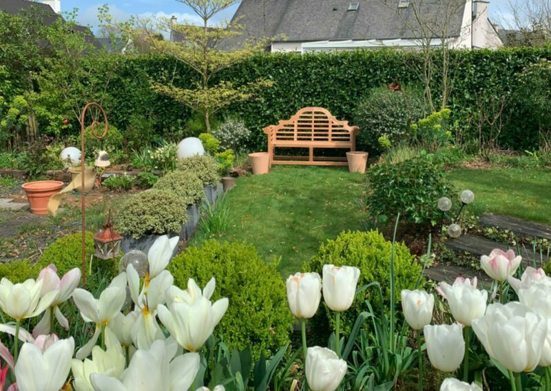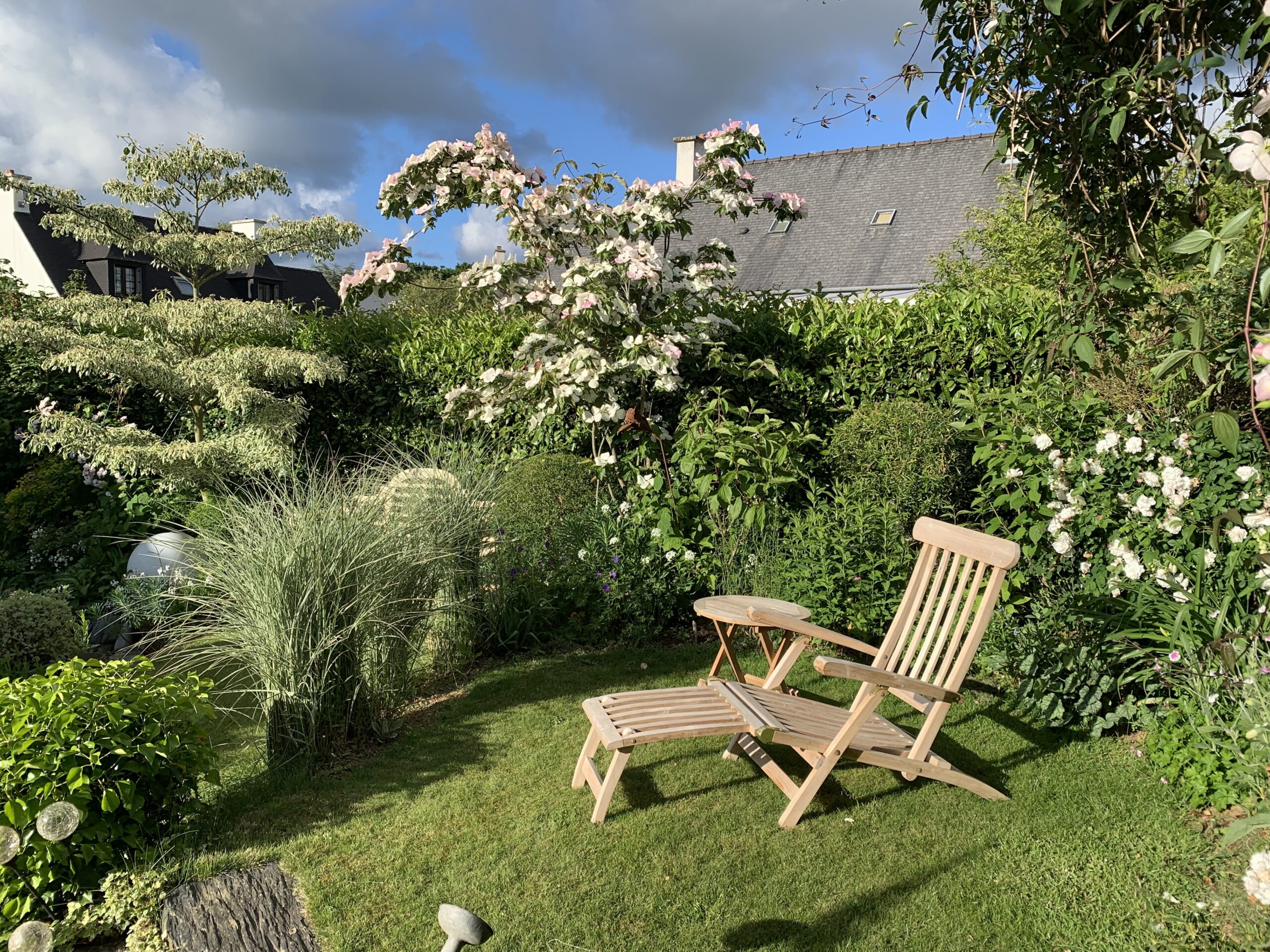 Au fil des saisons, le jardin s’anime : les floraisons printanières des cornouillers, des viburnums et des narcisses laissent place aux roses blanches, aux agapanthes et aux gauras estivales, tandis que les feuillages persistants prennent le relais en hiver, maintenant l’élégance et la structure du lieu.
