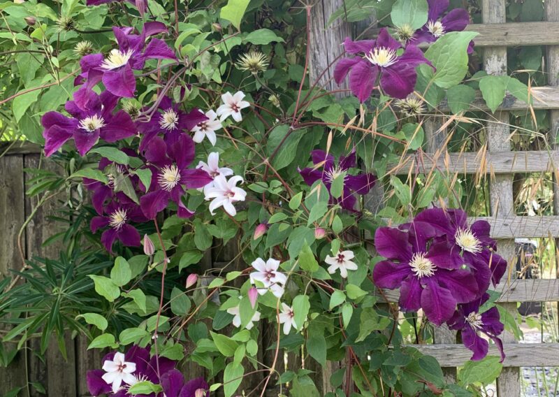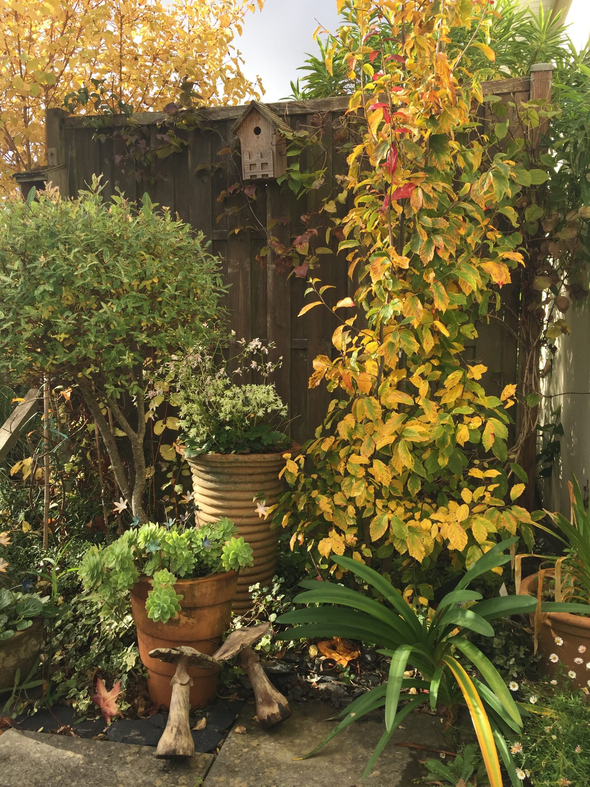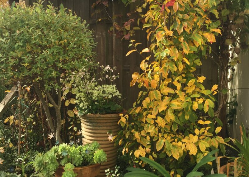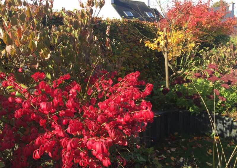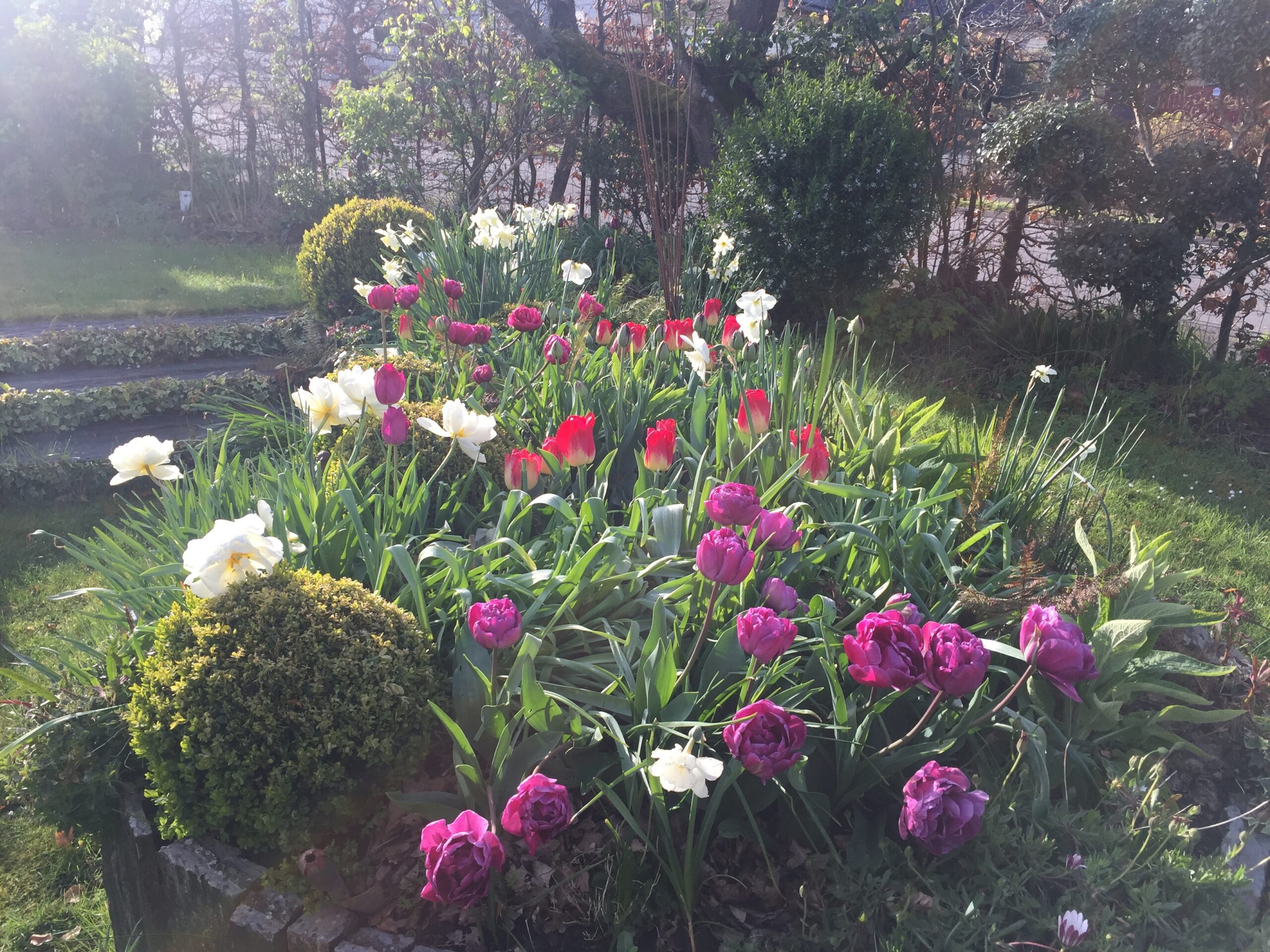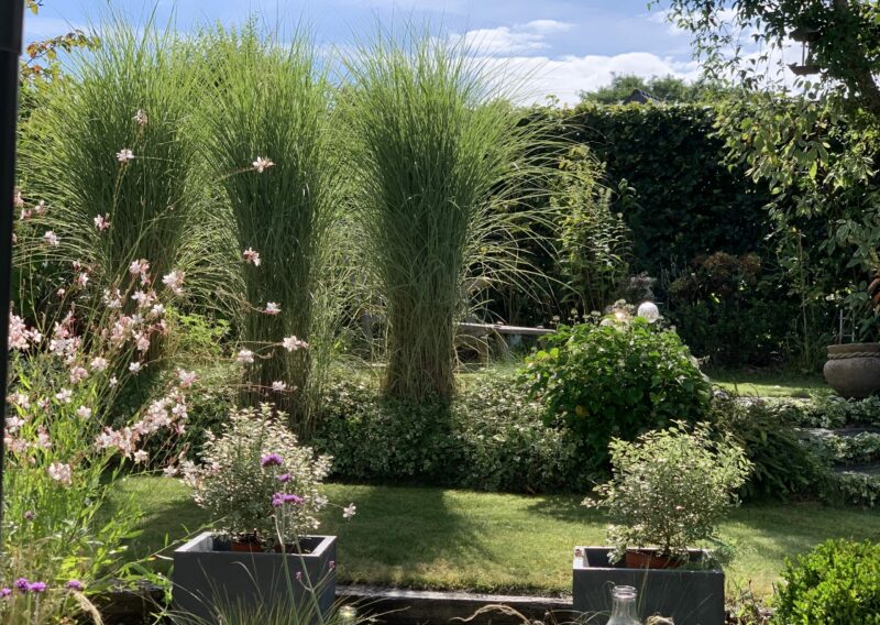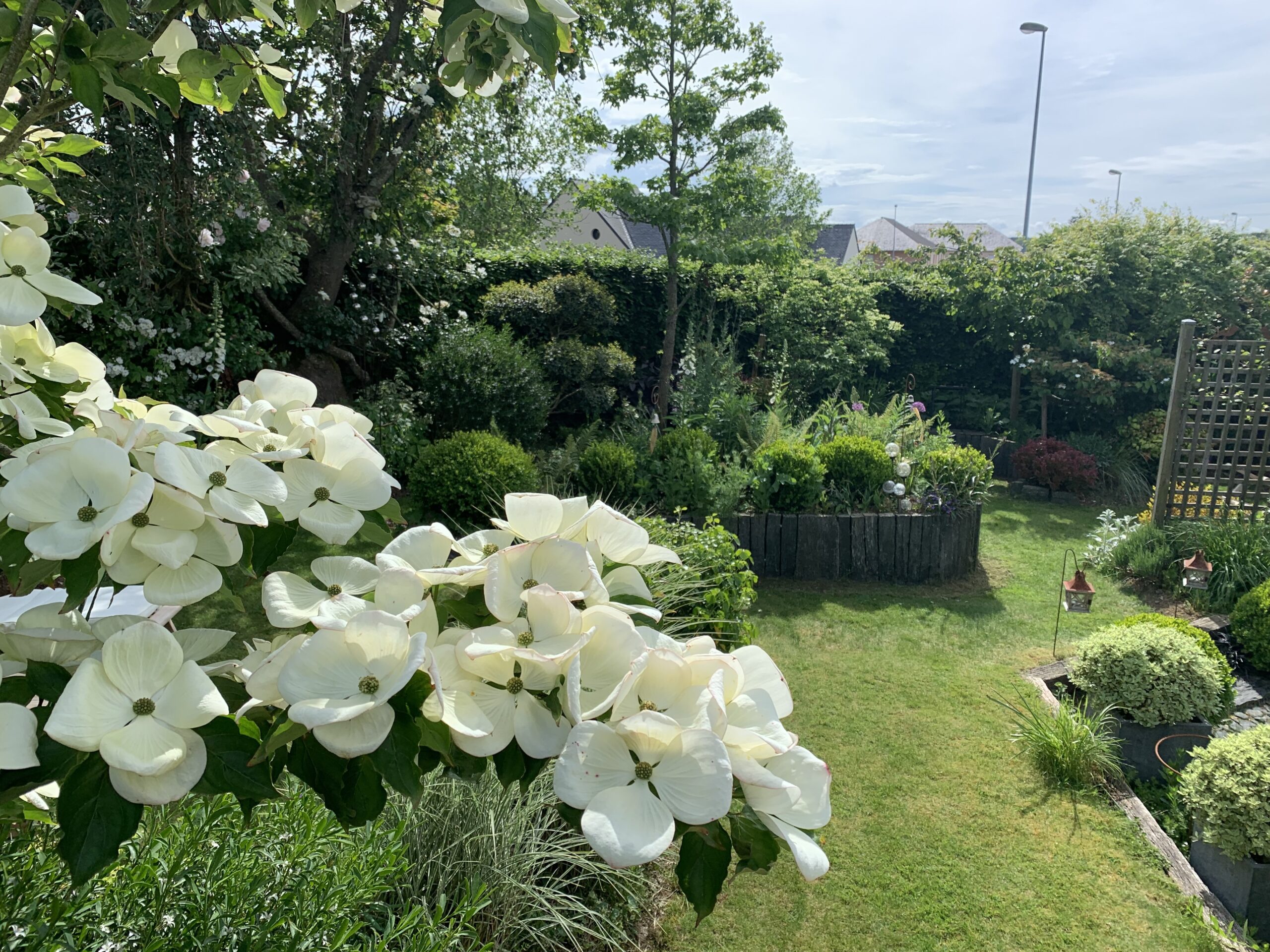 Au fil des saisons, le jardin s’anime : les floraisons printanières des cornouillers, des viburnums et des narcisses laissent place aux roses blanches, aux agapanthes et aux gauras estivales, tandis que les feuillages persistants prennent le relais en hiver, maintenant l’élégance et la structure du lieu.