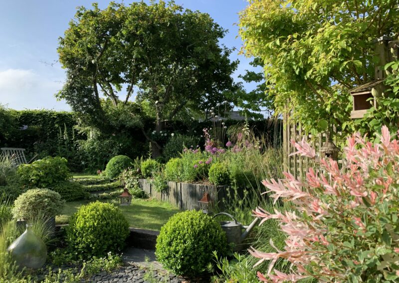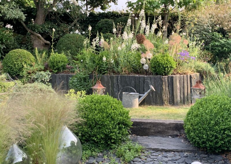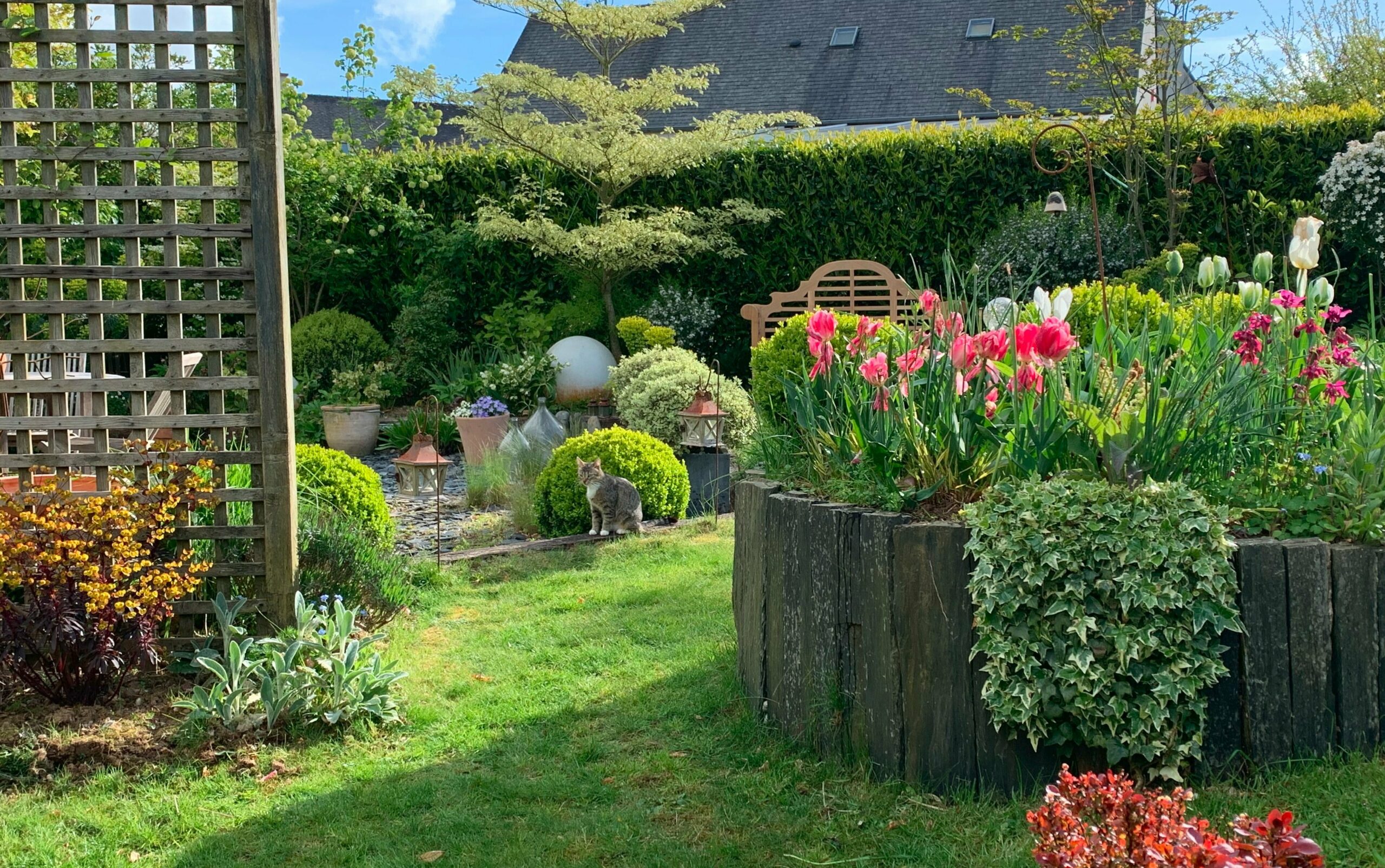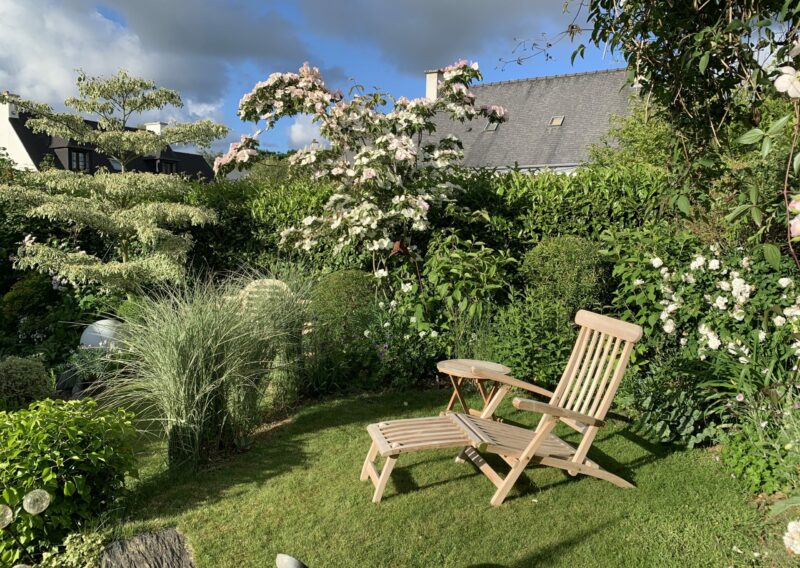 Chaque recoin a son caractère : une pergola intime pour les repas d’été, des bancs discrètement installés pour la contemplation, un parterre géométrique structurant l’espace, et des massifs légèrement surélevés pour créer du relief.