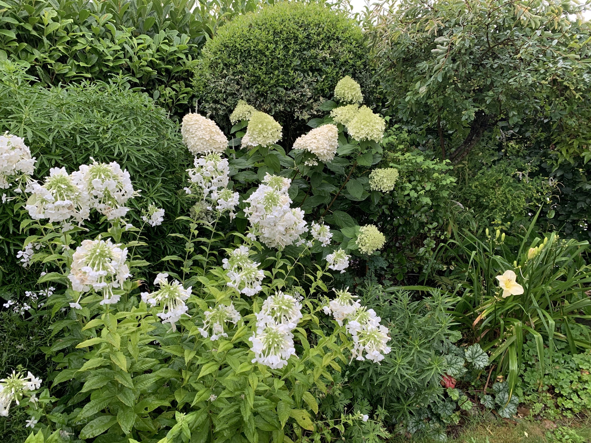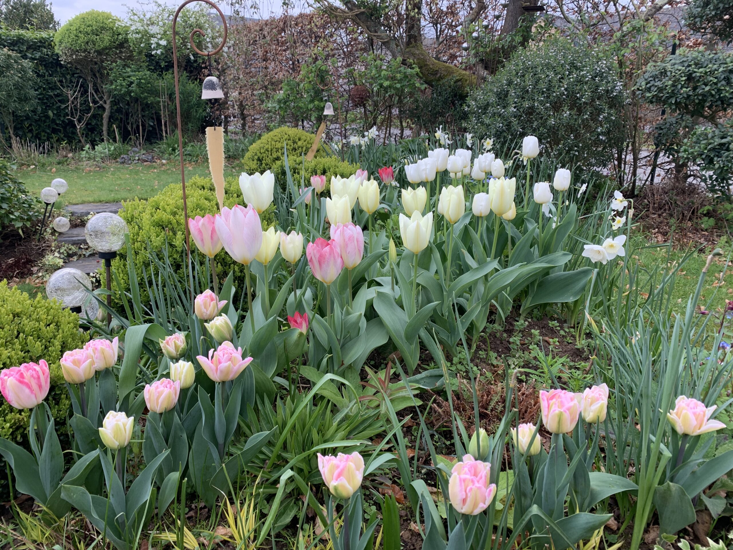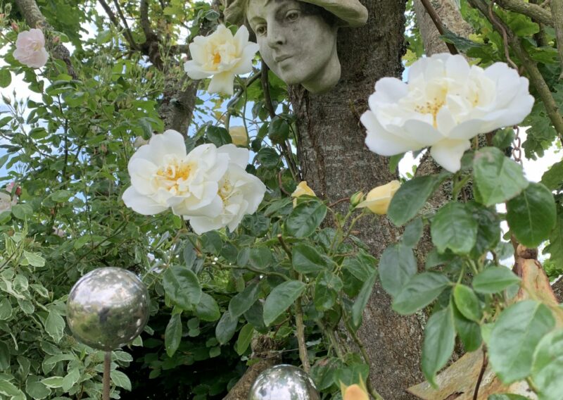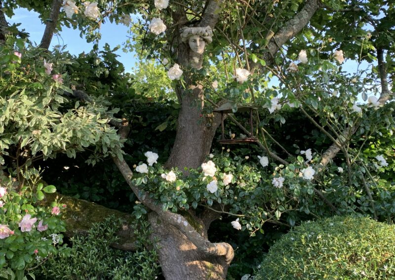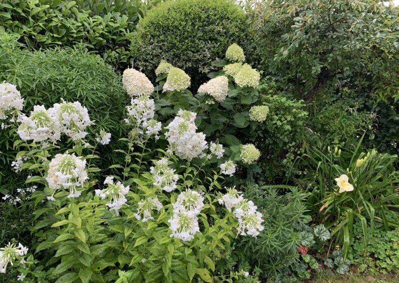 Autour de lui, le jardin s’articule en plusieurs ambiances, mêlant rigueur géométrique et formes plus libres. Des allées sinueuses bordées de massifs aux floraisons claires invitent à la découverte. Blancs crémeux, ivoire et argents se déclinent dans un camaïeu subtil, souligné par des feuillages texturés et des touches de lumière naturelle.