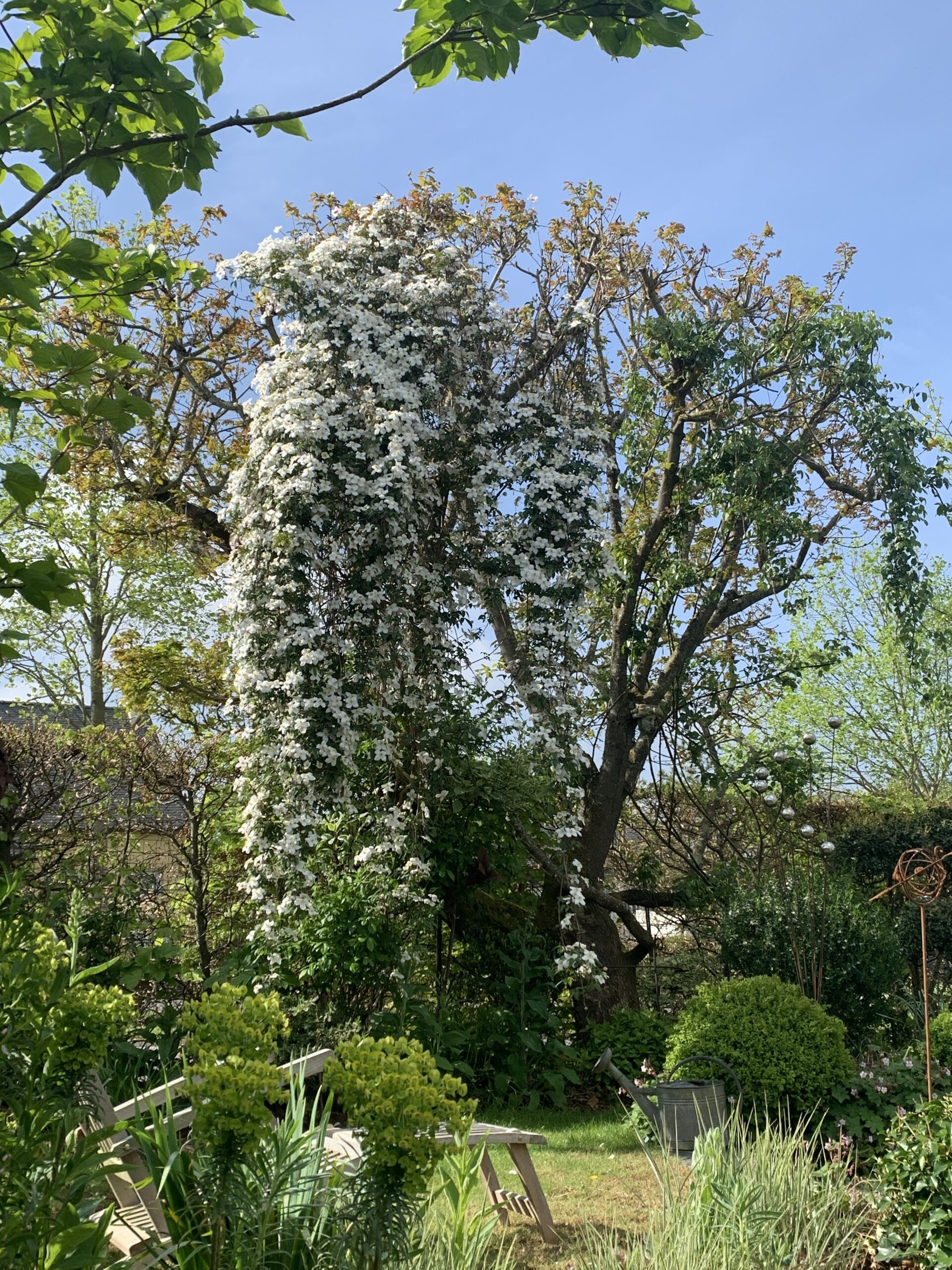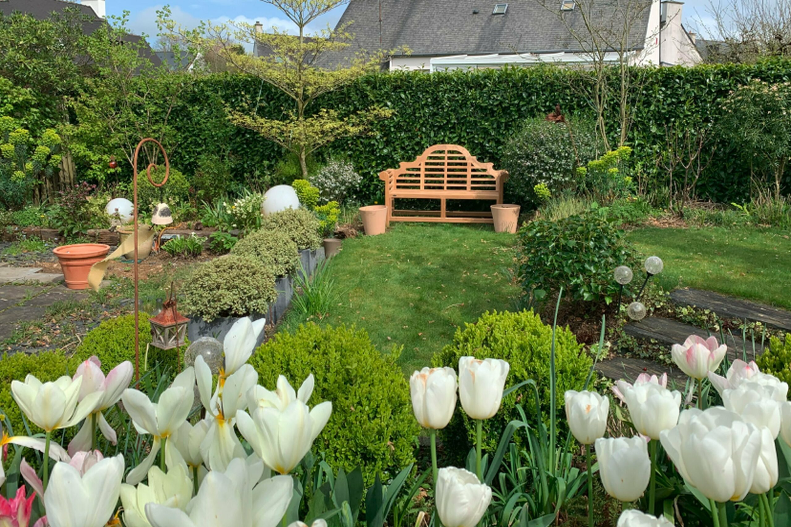 Niché dans un écrin de verdure de 250 m², ce jardin blanc s’organise en une composition élégante et apaisante, pensée pour offrir une promenade sensorielle tout au long de l’année. Depuis la maison, le regard est naturellement attiré par le vieux chêne, véritable sentinelle végétale qui domine l’espace et en devient le point de mire.